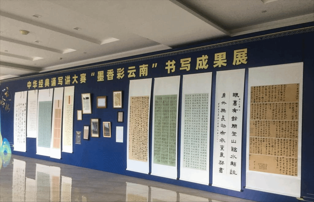 第五届“云岭杯”中华经典诵写讲大赛·汉字书写大赛教师组一等奖作品《毛主席诗词选抄》(作者:尹一;单位:玉溪师范学院),作为高校教师组获奖作品在云南广播电视台演播大厅展出。