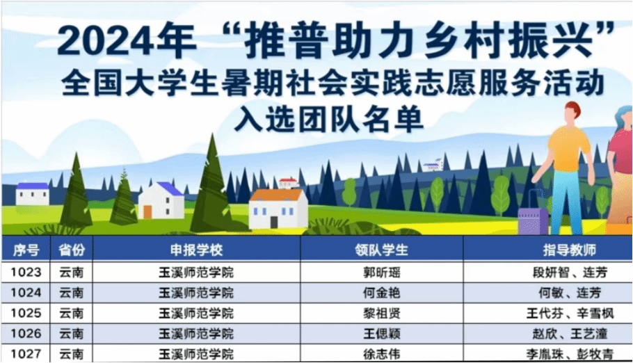 为深入贯彻落实党的二十大关于“加大国家通用语言文字推广力度”的决策部署,贯彻落实习近平总书记关于教育的重要论述和关于语言文字的重要指示批示精神,服务铸牢中华民族共同体意识,助力教育强国、文化强国建设,教育部语言文字应用管理司、共青团中央青年发展部开展2024年“推普助力乡村振兴”全国大学生暑期社会实践志愿服务团队申报活动。全国共有1452所高校的6998支团队7万余名师生报名,经过专家审议,1200支团队入选。玉溪师范学院共有5支团队入选,入选数量居云南省高校第二。