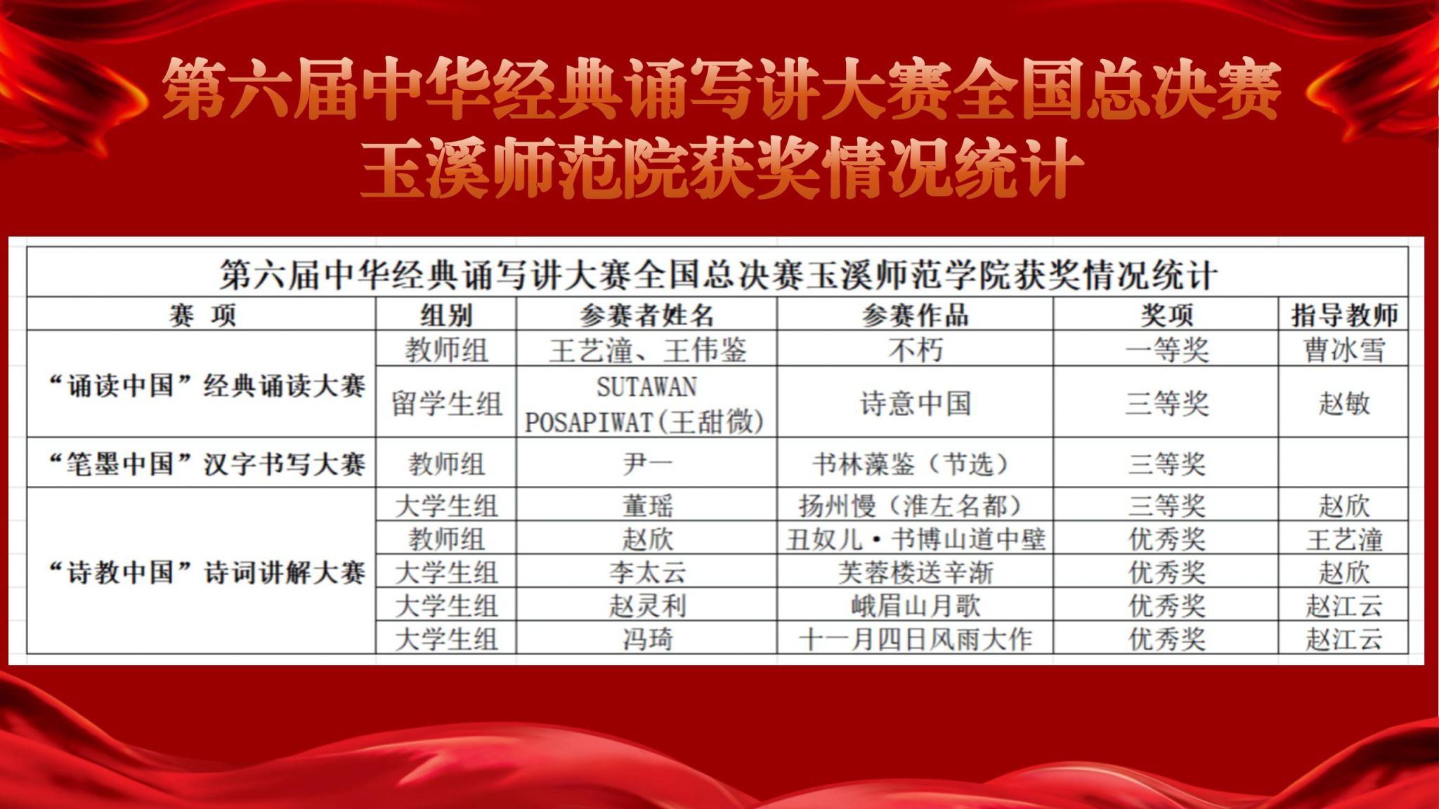 中华经典诵写讲大赛是由教育部、国家语委主办,教育部语言文字应用管理司负责实施的全国性赛事活动,目前已列入全国普通高校大学生竞赛目录。2024年4月,教育部、国家语委启动了第六届中华经典诵写讲大赛,近日大赛完成全部赛程并公布获奖名单,玉溪师范学院师生在三大赛项中喜获全国一等奖等8个奖项。