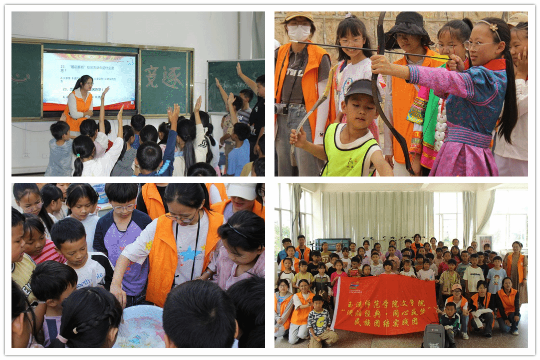 玉溪师范学院文学院“浸润经典•同心筑梦”民族团结实践团一行12人于2024年7月15日—21日走进通海县兴蒙中心小学,开展第九届“童成长•嗨起来”大学生假期志愿服务活动。除开展常规假期学业辅导、读书分享、安全教育外,实践团还结合实践队员的专业知识与特长开设了“共读诗经”“非遗乐学”“诗海拾贝”等特色课程。实践团跟随蒙古族服饰市级项目非遗传承人赵清丽老师的脚步走进蒙元历史文化博物馆,采访非遗传承人、民间手工艺人和民族团结进步模范代表,聆听蒙元历史故事,和小朋友一起制作非遗漆扇,体验射箭项目。