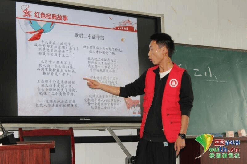 图为队员王传电在带领小朋友学习《歌唱二小放牛郎》。中国青年网通讯员 赵碧姣 供图