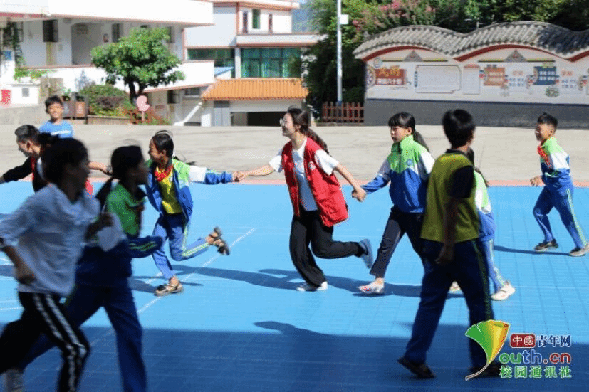 图为队员在龙坝镇小学操场带领小朋友开展户外游戏。中国青年网通讯员 陈思怡 供图