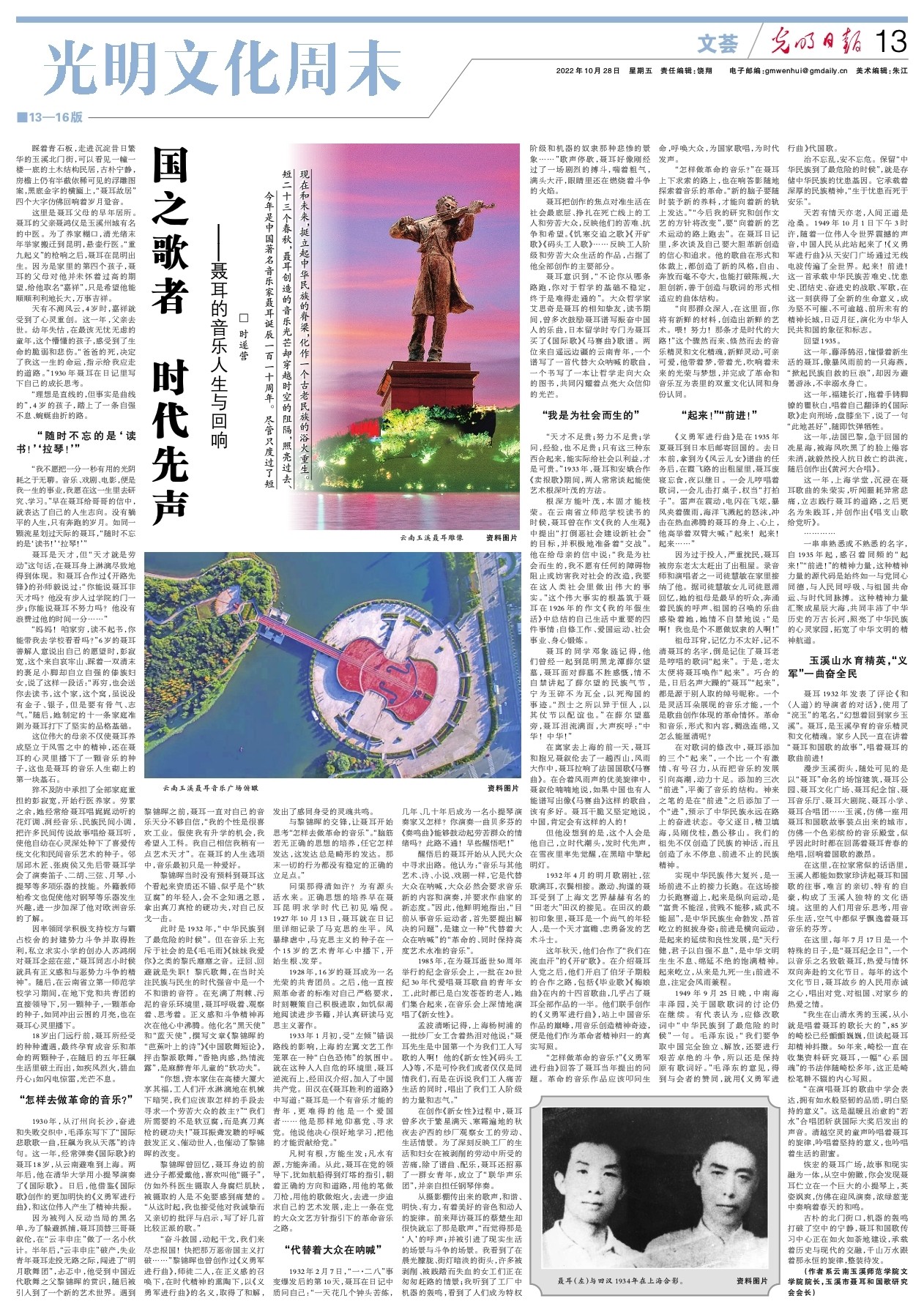 10月28日,《光明日报》第13版以《国之歌者时代先声——聂耳的音乐人生与回响》为题,整版刊发了我校文学院院长时遂营纪念音乐家聂耳诞辰一百十一周年的文章。文章将人民音乐家聂耳二十三年的人生娓娓道来,展示了他艰苦求索、为国而歌、短暂光辉的一生,聂耳和国歌的故事在波澜壮阔的历史背景中,迸发出生机与活力,穿越时空,与身在聂耳故乡的你我相连接。