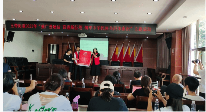 为深入学习宣传贯彻党的二十大精神和习近平总书记关于语言文化的重要指示批示精神,9月15日,玉带街道以铸牢中华民族共同体意识为主线,开展“推广普通话 奋进新征程 铸牢中华民族共同体意识”主题宣讲活动,进一步加大国家通用语言文字推广力度,传承弘扬中华优秀语言文化,营造学习使用国家通用语言文字的浓厚氛围。本次活动共有街道、社区、少数民族代表等65人参加,其中包括玉带街道党工委宣传委员贾黎鹏、玉溪师范学院宣传部副部长戴志、玉溪师范学院宣传部舆论宣传科科长张晶晶、玉溪师范学院新闻中心校报编辑部主任廖鹏飞。