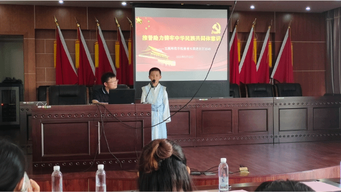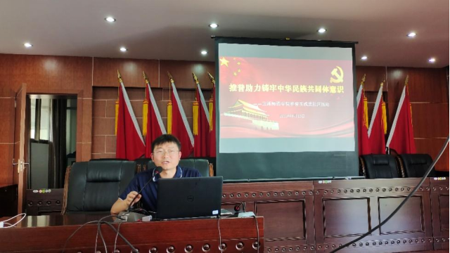 本次活动,邀请玉溪师范学院新闻中心校报编辑部主任廖鹏飞老师到玉带街道作专题宣讲。廖老师以《推普助力铸牢中华民族共同体意识》为题,围绕中华民族共同体意识的时代背景、应对挑战、铸牢目的、认同根本、认同核心、认同渊源、顶层构设、文化载体、具体举措等方面进行宣讲。